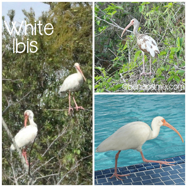 Another we bird we saw often, in the Everglades, and then poolside at our hotel in Key West, was the White Ibis. The ibis is a non-visual forager, meaning it does not look for prey with its eyes. Instead it forages for food in shallow waters, feeling for small fishes and crayfish with its beak. I was so excited to see and capture a photo of a juvenile White Ibis, with it’s gorgeous brown and white plumage. You can’t see it well in the photos below, but these birds have the most beautiful bright blue eyes!