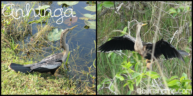 My favorite bird we saw was the Anhinga. These wading birds, also called Snakebirds, differ from the others in that they actually swim with everything but their heads submerged under the water. Their heads look a bit like snakes ready to strike as they skim the water searching for food. Anhingas do not have the same oils on their wings as ducks, which keeps them from being buoyant on top of the water. This also means that their feathers become waterlogged. It is not uncommon to find them perched near the water, wings fully expanded, drying in the sun. They are unable to fly again until their wings are dried.