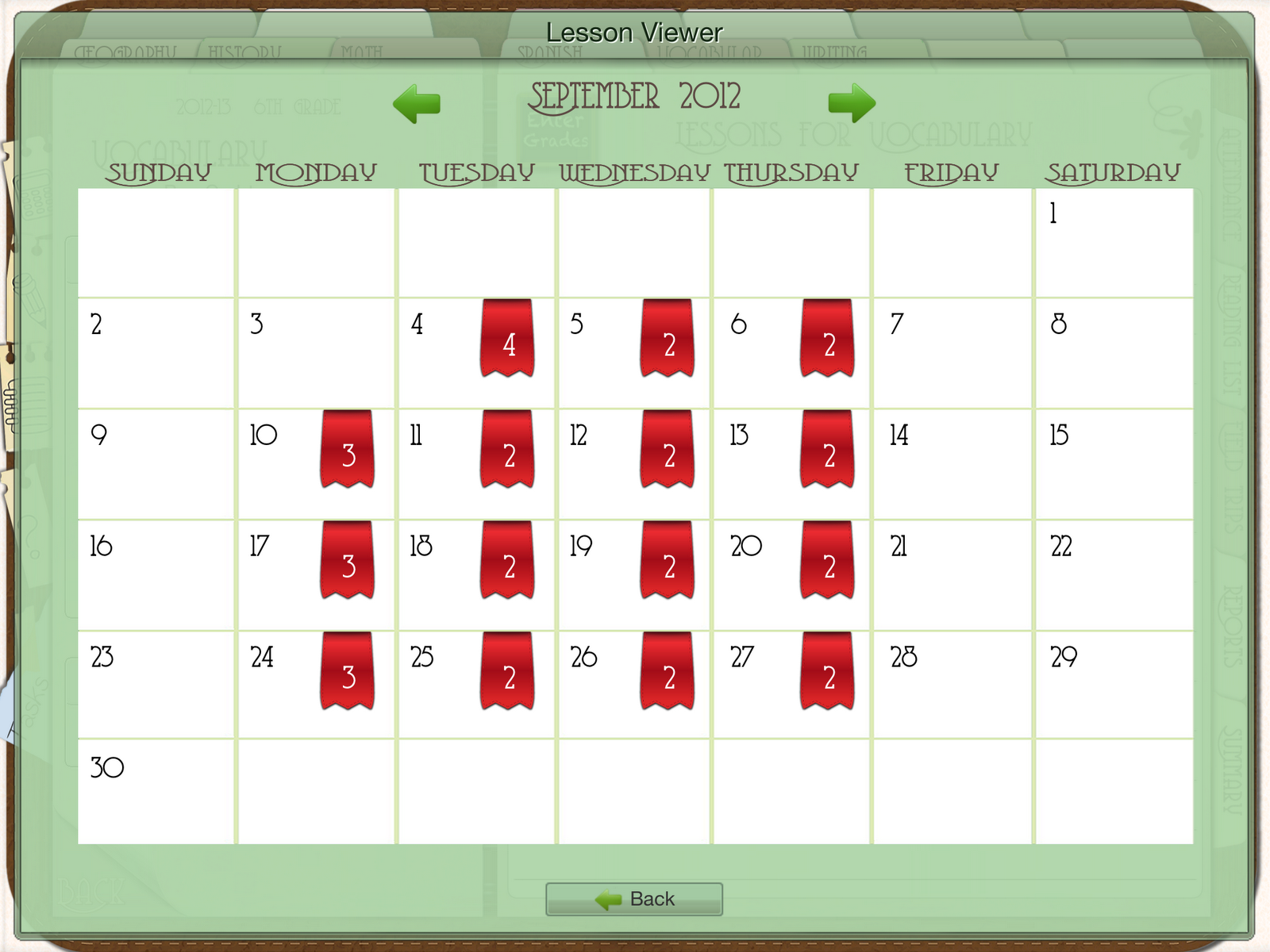 A nice monthly calendar shows which days you have courses scheduled with a little red flag. The number indicates how many different assignments there are each day. If you click on one of those red flags, it will bring up your student’s lessons for that day. You’ll notice that Fridays are blank on our calendar. That’s because we don’t schedule anything for Fridays. We leave those days open for “Friday Fun School” and Field Trip Friday.” I wish that the field trips we have scheduled showed up there. That would make this app just about perfect.