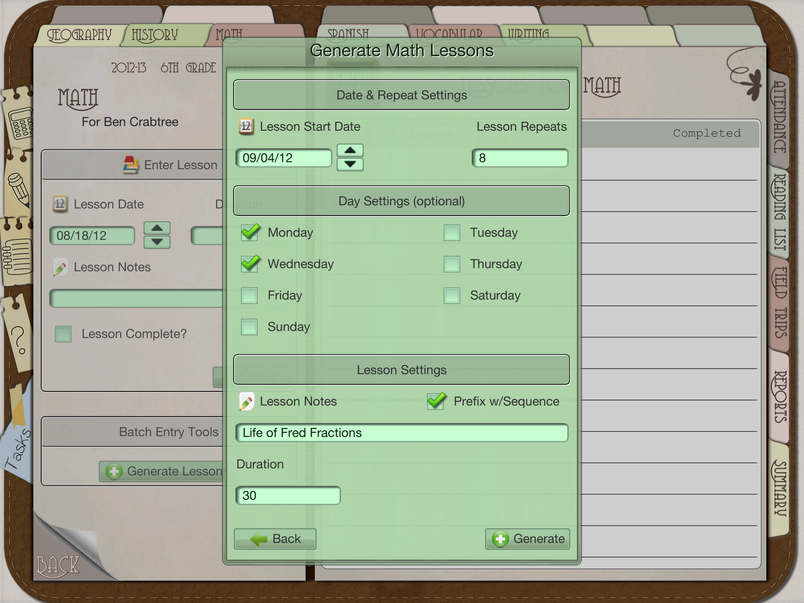 Once the lessons are entered, when you click on the “Math” tab at the top, this is what you see. If you click on the little box that reads “Enter Grades,” you can do just that — record daily grades, as well as quizzes and tests. You can also edit this page to note when the lessons have been completed. You’ll notice the numbers in parentheses with Life of Fred. Those are there because I checked the “prefix with sequence” box above. The numbers happen to correlate with which lessons I expect Ben to do those days.
