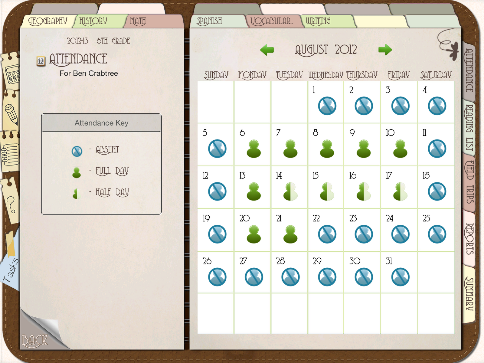 First up is the Attendance Chart. It’s very simple to use. You just tap on the date once for a full day of school and twice for a half day. The default is “absent.”