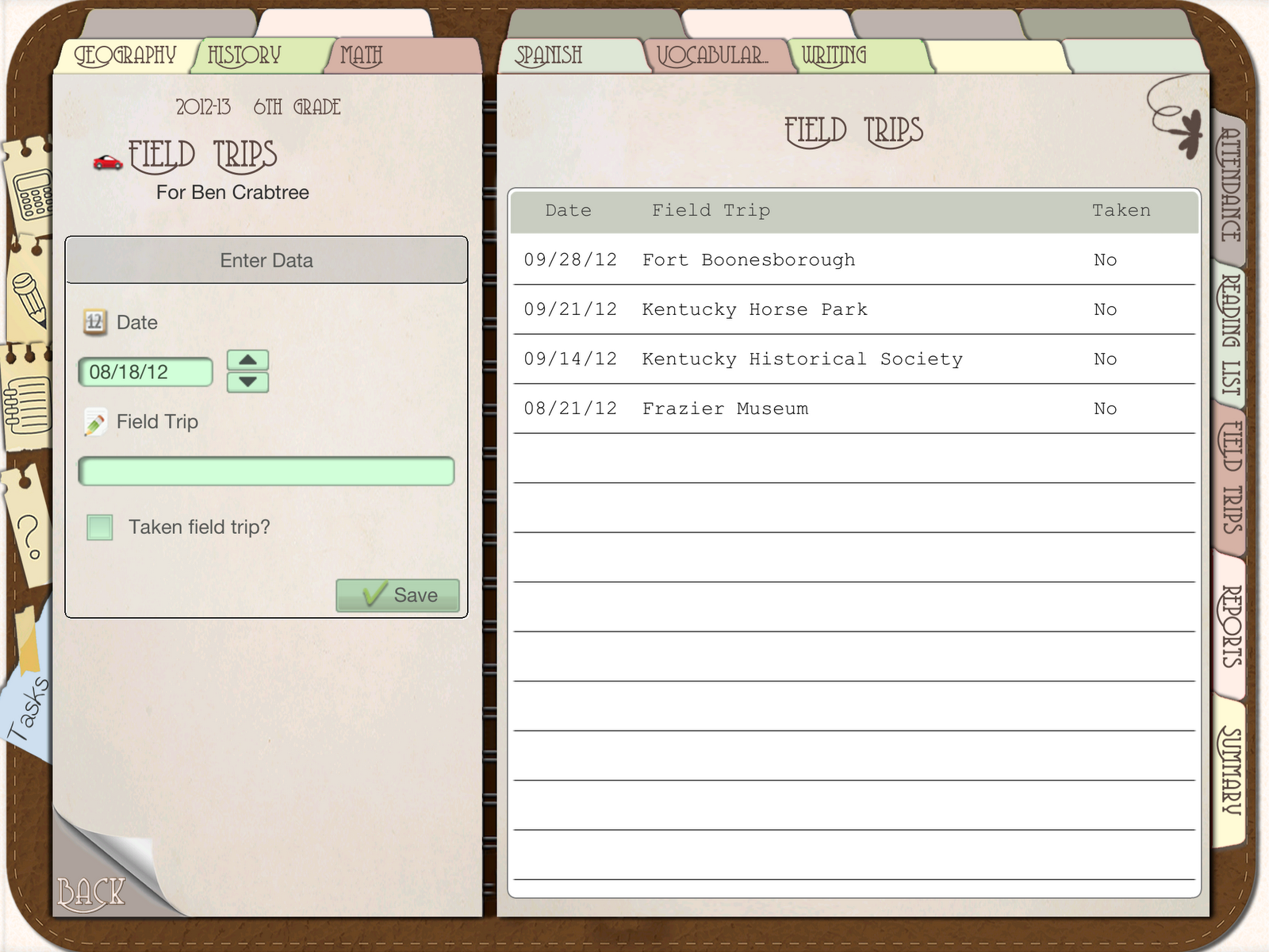 For a family like ours who thrives on field trips, I love that they included a tab for Field Trips. I’ve already entered some that are upcoming. Once we have completed the field trip, I can go in and edit that part. I’m hoping that I won’t forget any field trips this year!
