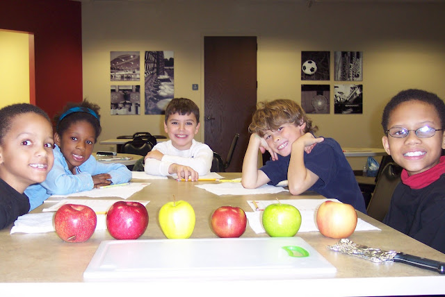 Today, our co-op got together to continue our Autumn Treasures study. Today we learned about apples and Johnny Appleseed. We began by reading a few books and then did an apple taste-test! The kids all loved this and it was very interesting to see which apples they really liked, and which apples they didn’t really care for. Personally, I’ve never met an apple I didn’t like, but I was even surprised on my own preference for certain apples. I like the more tart apples, as did Ben. But a couple of the children (and one mom) really preferred the sweeter apples.The children each had a form to complete, describing the color, smell, and taste of each apple. We had Golden Delicious, Granny Smith, Macintosh, Johnagold, Fugi, and Ida Red apples to try. Here are the books we read today…
