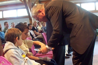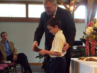 | Pastor Scott presents Ben with a new Bible |