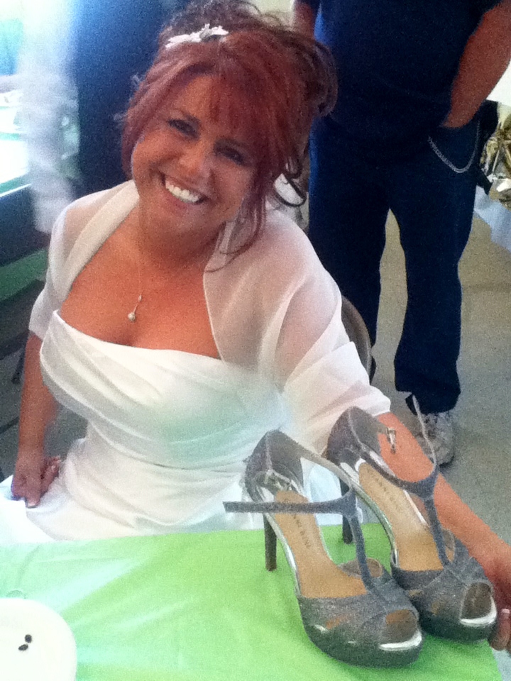 On Saturday, we attended the wedding of a friend from Dad’s work. Here’s the lovely bride . . . and her shoes. Her feet were killing her! And no wonder. Those heels were almost as tall as she is!