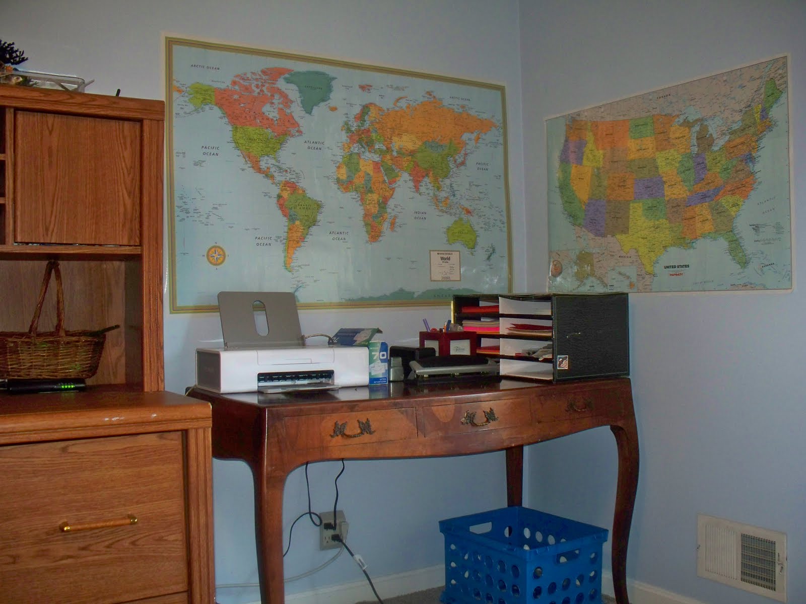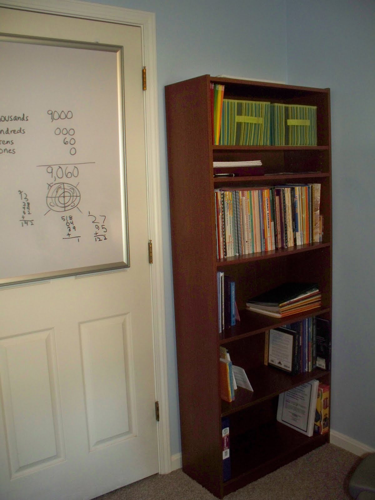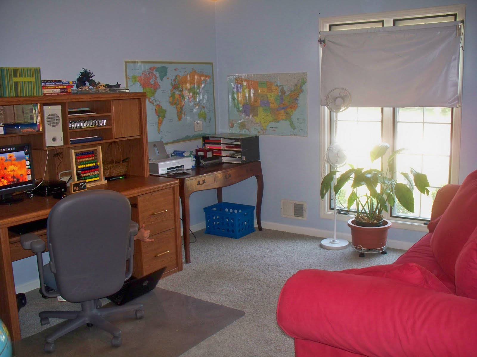 Ben and I have been hard at work this week, turning our former guest room/office into our new school room. In the past, I never really had the desire for a school room. We just did school wherever….kitchen table, family room sofa, deck, park, everywhere! But this year, Ben is doing more work using his desktop (Amanda Bennett unit studies, Download N Go, Teaching Textbooks, Time4Writing, etc.), so it made sense to center our homeschool around his computer. Besides, he was borrowing my laptop far to much 😉 We’ll still go to the kitchen table for larger or messy projects.