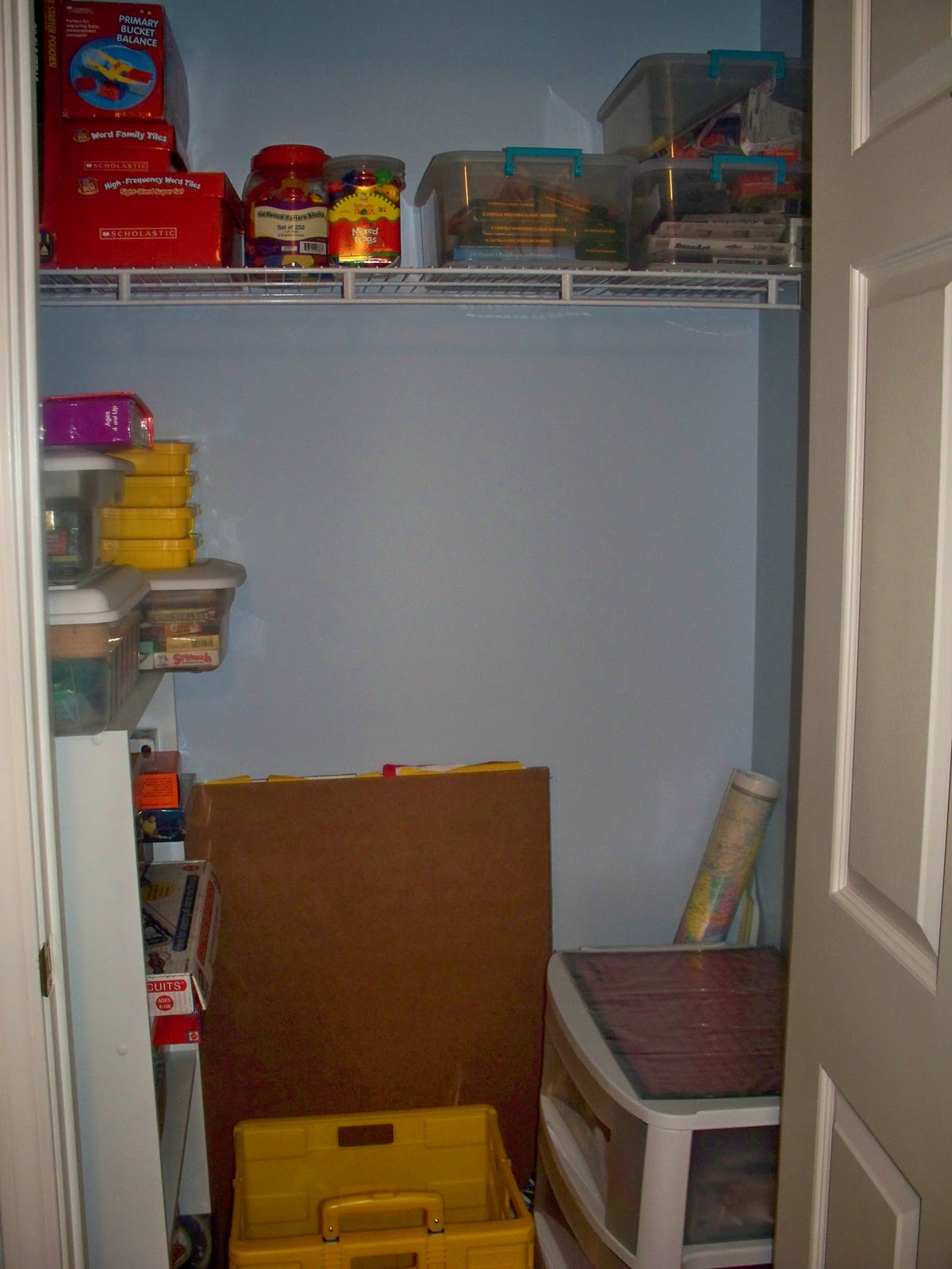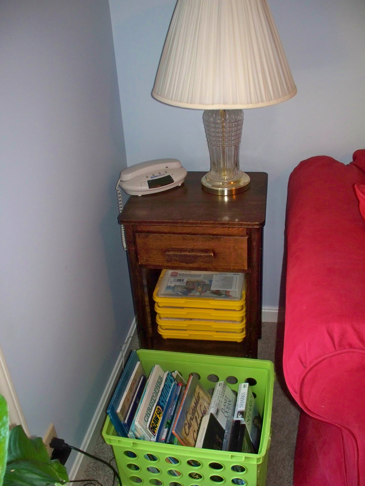 | the green basket holds our books/videos for our current unit study, the yellow boxes are Lego Education sets |