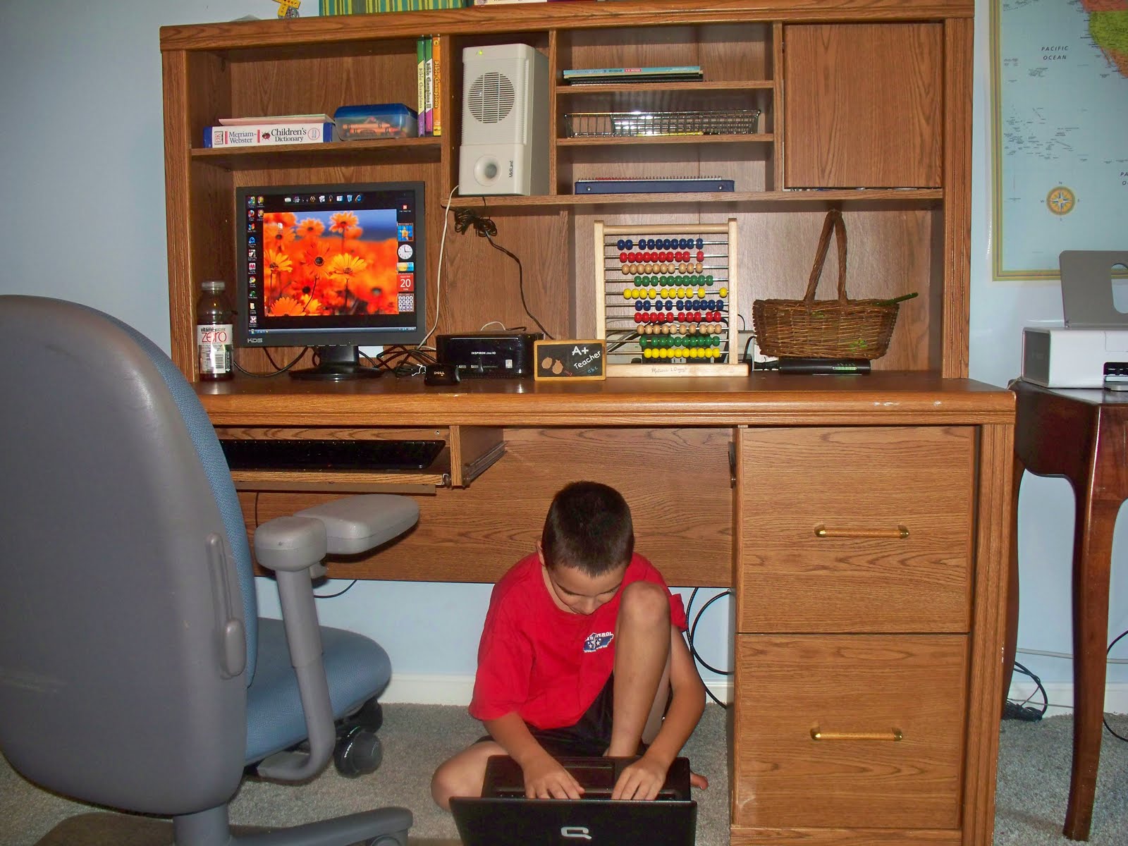 | Ben’s desk…yes sometimes he still steals my laptop! And yes, sometimes he prefers to be under the desk 🙂 |