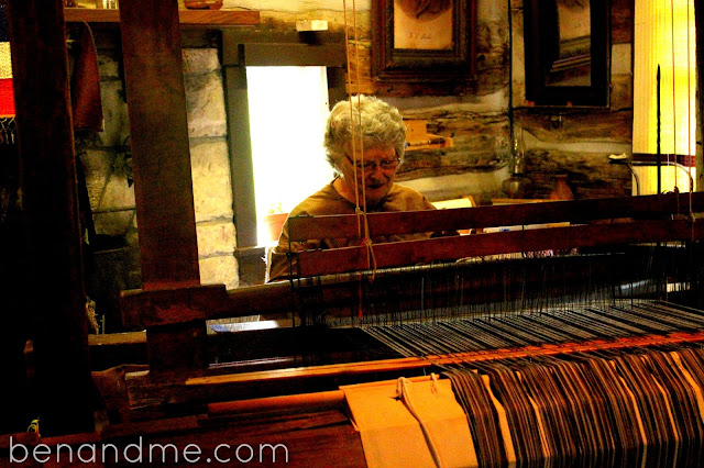 At Spring Mill, not every interpreter is available every day (they each have days off on either a Mon/Wed or Tues/Thurs schedule, so that everyone is available on the busy days — Friday, Saturday, and Sunday. Because we were there on July 4th, all of the historic interpreters were on hand. Unfortunately, that meant that not everyone was there the next day, a Friday. We missed out talking with some, thinking that everyone would be there on Friday, as usual. We did see and speak with quite a few though — the miller, weaver, broom maker, leather worker, lace maker, and blacksmith among them.