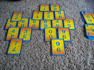 Pyramath is played with a deck of 56 cards, numbered from 0-9.  You begin by laying down 5-7 cards in a row, placing the rest in a pile to the side.  Each player takes turns drawing a card from the pile and then looks for 2 cards side-by-side in the row that when added, subtracted, mulitplied, or divided equal the card drawn. That card is then place between the cards so that as time goes on you are building a pyramid.