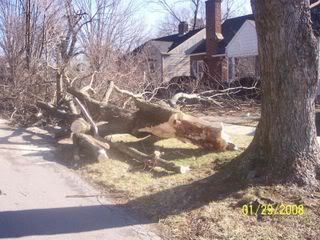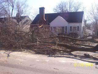 First of all, let me say there was no damage to our house or the house next door. The tree that fell was an oak, about 100 years old. It was in the front of the neighbors house to the right. Had this tree fallen a different direction, it would have crashed into the neighbors house, possibly hurting or killing a wonderful 80 year old widow. Instead it fell across our driveway and front yard, and only damaged a Bradford Pear tree that was in front of our house. Blessing number one.