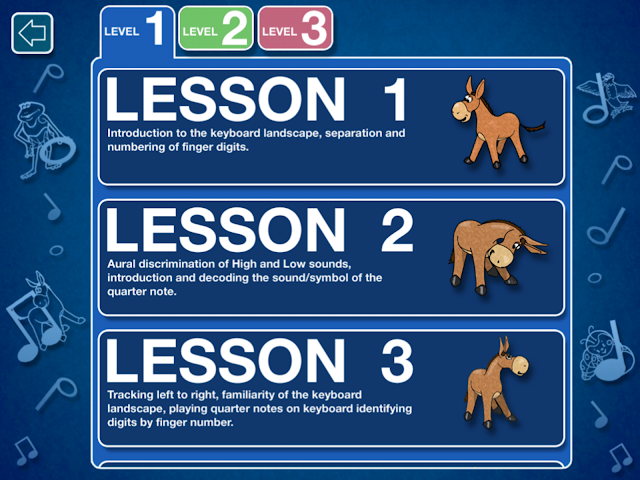Tapping on “lessons” will bring up this screen . . . there are actually 10 lessons per level. The one thing I did notice is that there is no place keeper function. As your students are working through the lessons, you (or they) will have to remember where they left off each time.
